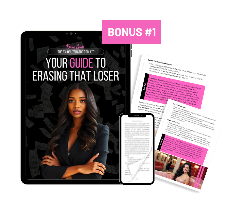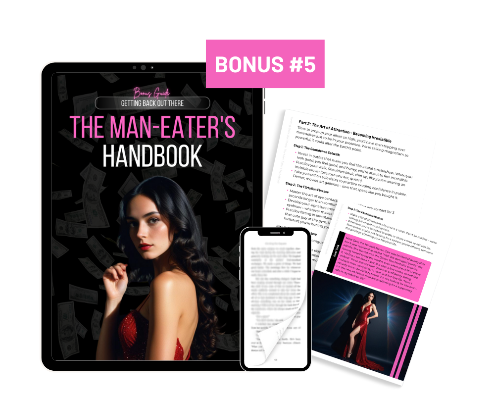 ALSO INCLUDED: 🎁 5 FREE BONUS GIFTS 🎁 that help you block his ass for good, skyrocket your self-worth, and become a certified man-eater (total value of $184)